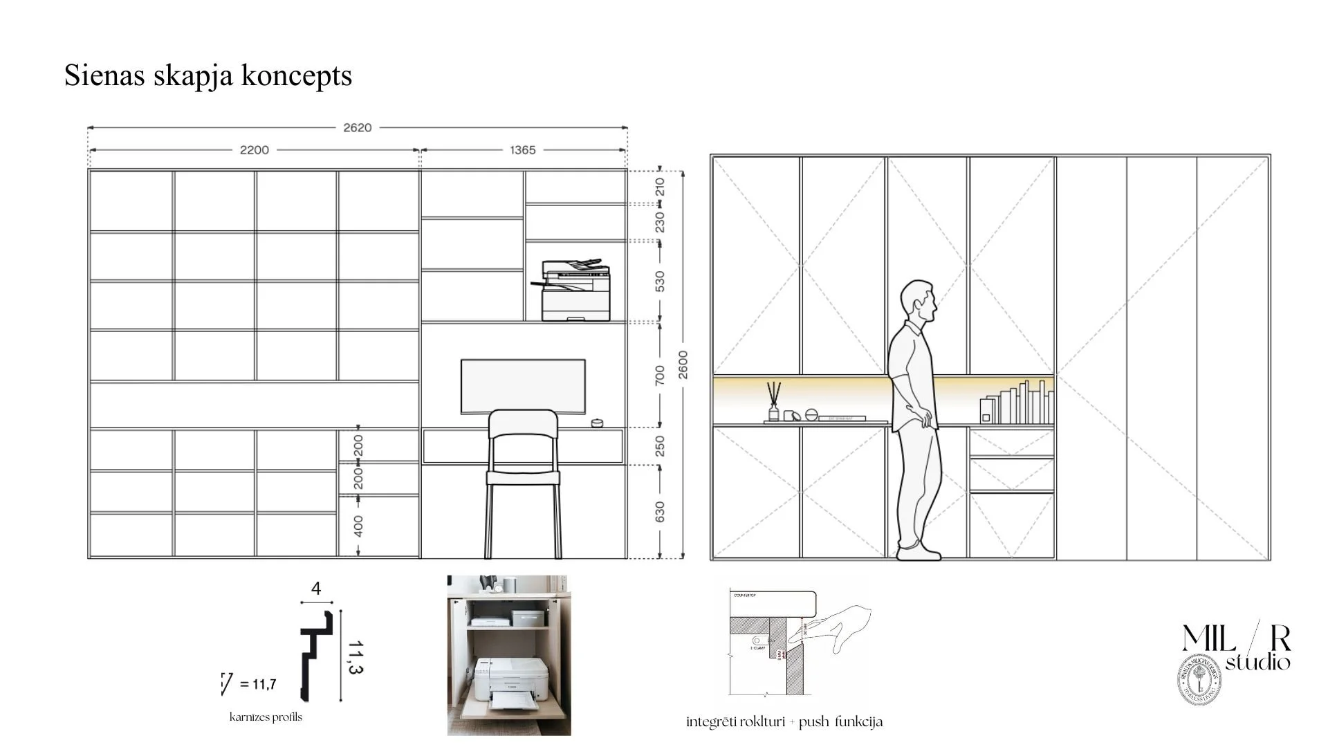 Ģimenes mājas projekts, radīts, lai risinātu glabāšanas vietas ierobežojumus. Skice koncentrējas uz praktisku un estētisku risinājumu kombināciju, iekļaujot daudzfunkcionālu mēbeli, vertikālu uzglabāšanu un slēptas glabātuves iespējas. Katrs elements ir veidots, lai maksimāli izmantotu telpu, saglabājot mājīgumu un funkcionālu ikdienu.